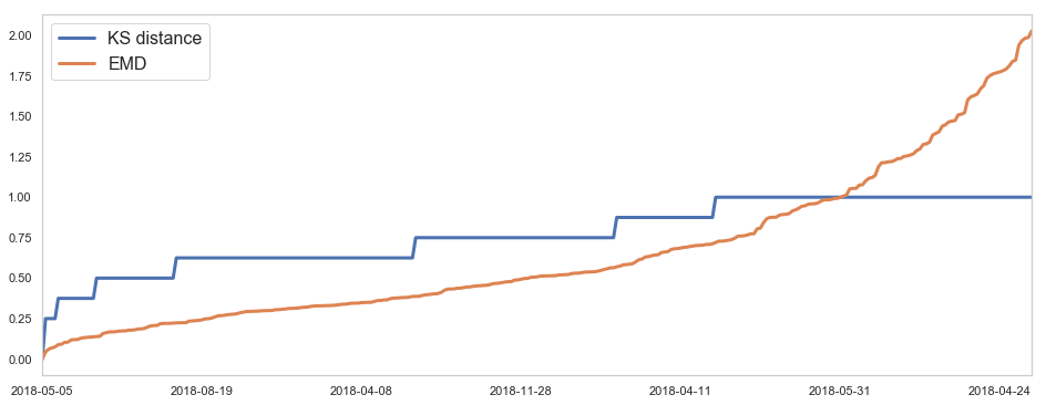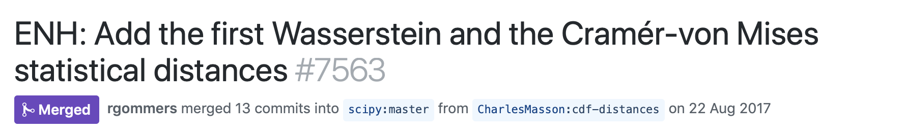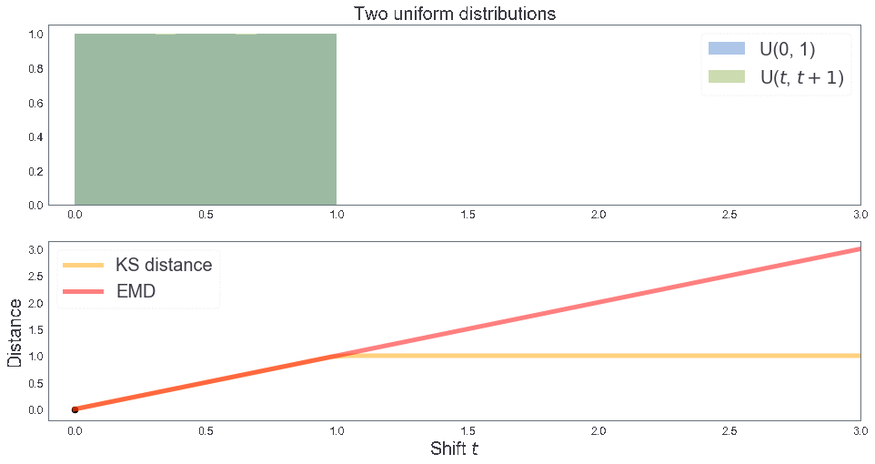 $$ KS(B, T):= \sup_{x\in \mathbf R} \left | F_B(x) - F_T(x) \right| $$scipy.stats.wasserstein_distance(u_values, v_values, u_weights=None, v_weights=None)
